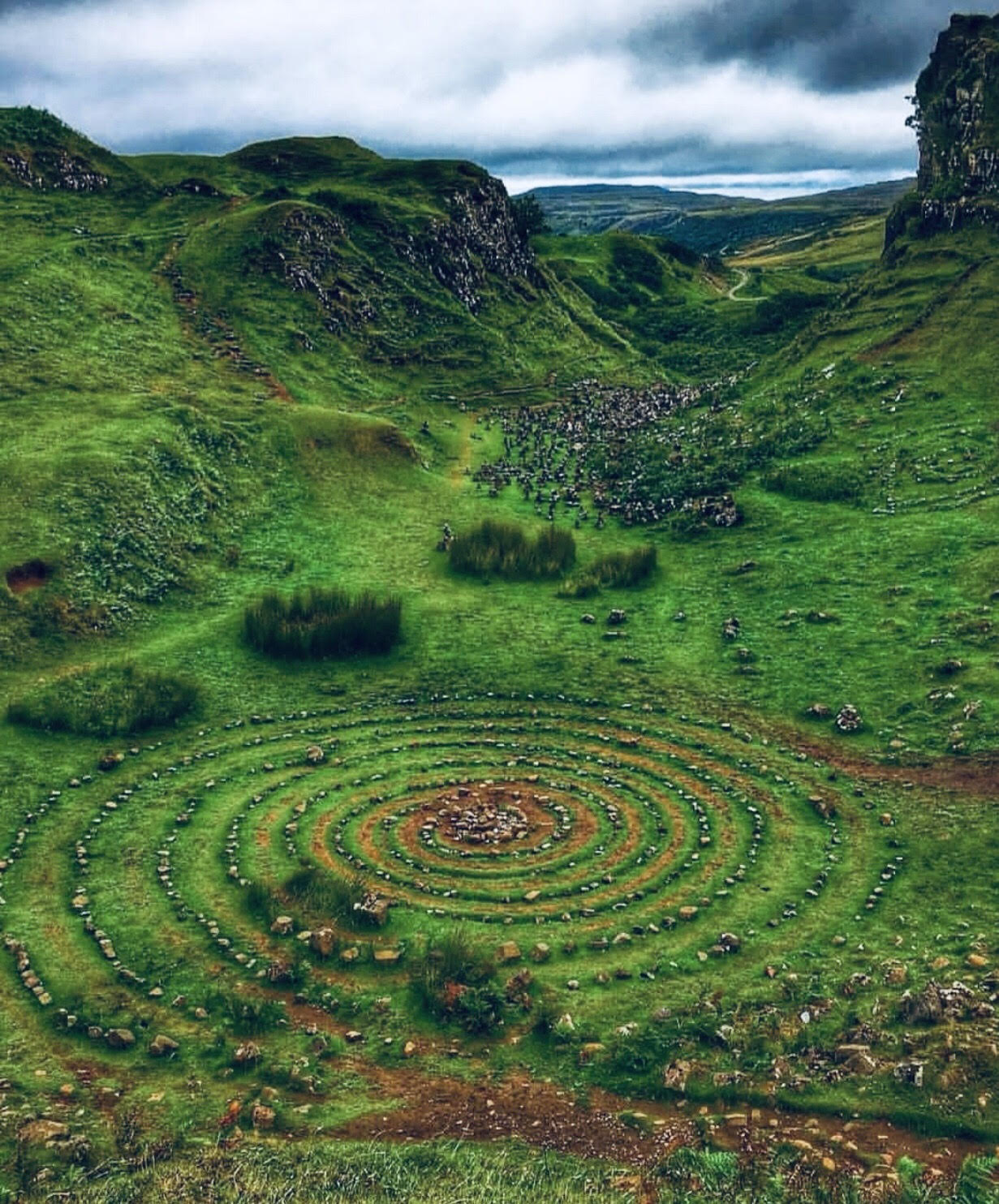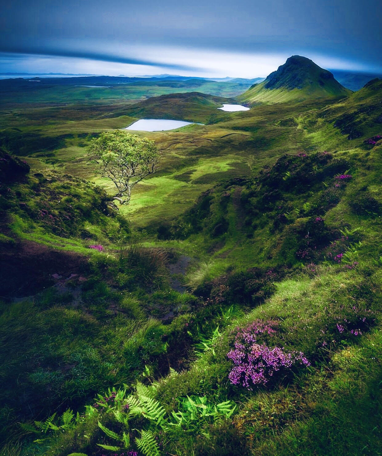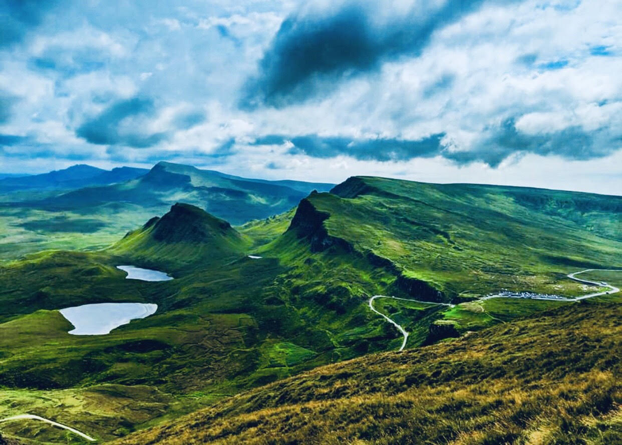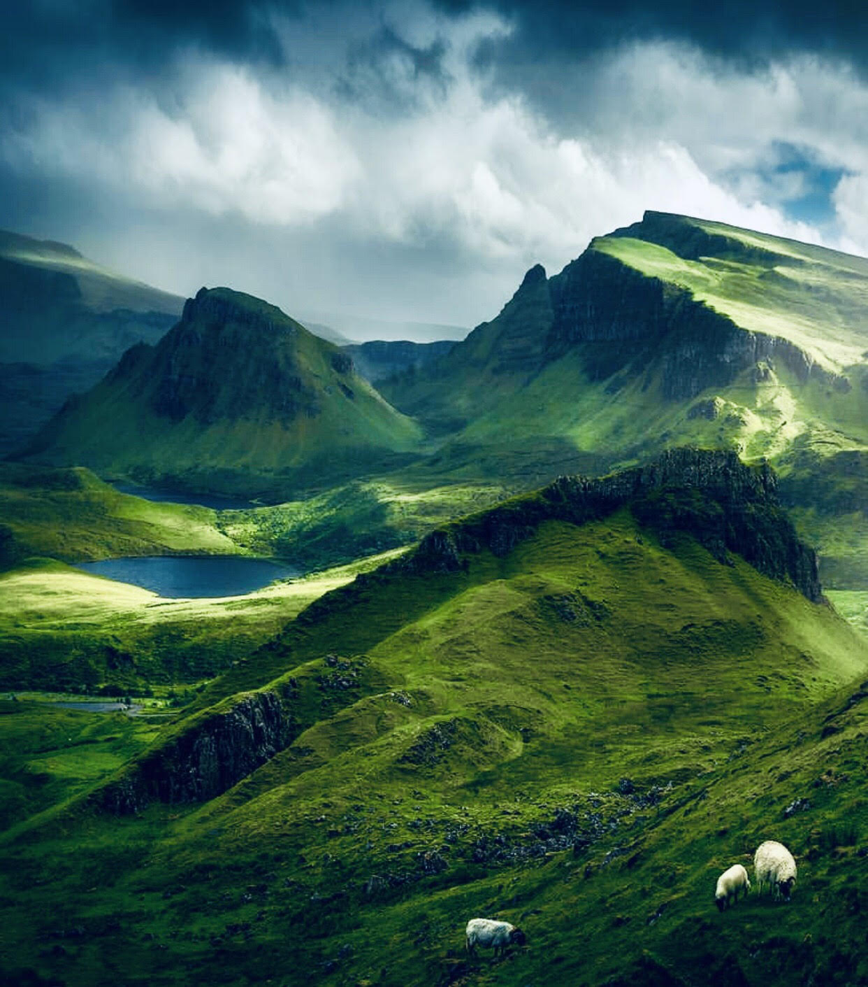Il Quiraing è un altopiano vulcanico dell’isola di Skye, si trova nella parte orientale del Meall na Suiramach. La strada con un’unica corsia e diversi tornanti che attraversa questi luoghi è davvero spettacolare e suggestiva. Montagne, vallate e roccia ricoperte di erba dalle molte sfumature: dal verde al rame, ed erica viola per arrivare poi a un paesaggio pianeggiante puntellato di casette bianche dipinte a calce dai tetti in ardesia grigia circondate da pecore, tante, tantissime pecore.