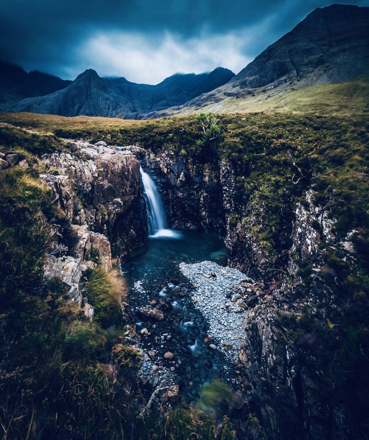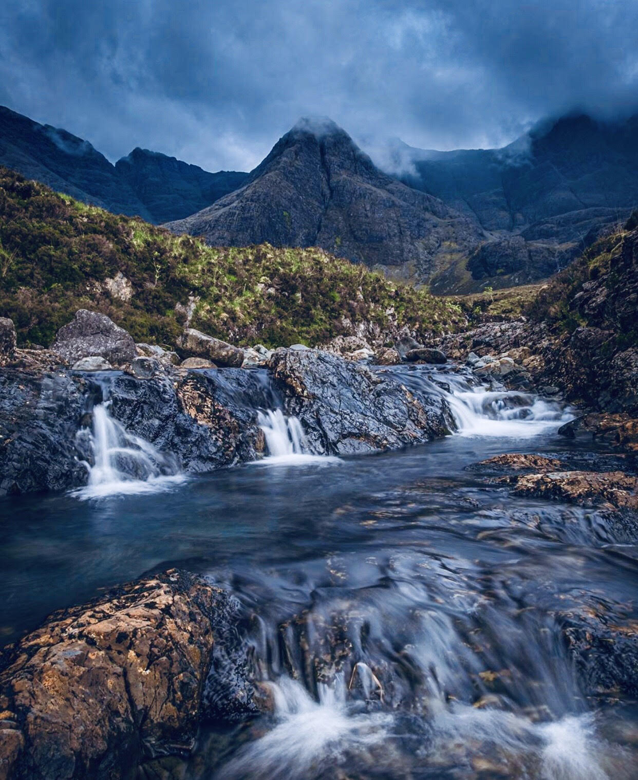 Un sentiero risale il fianco della montagna costeggiando le cascate, dietro le quali si ergono maestose le Cuillin Hills, tra le più spettacolari catene montuose della Gran Bretagna.