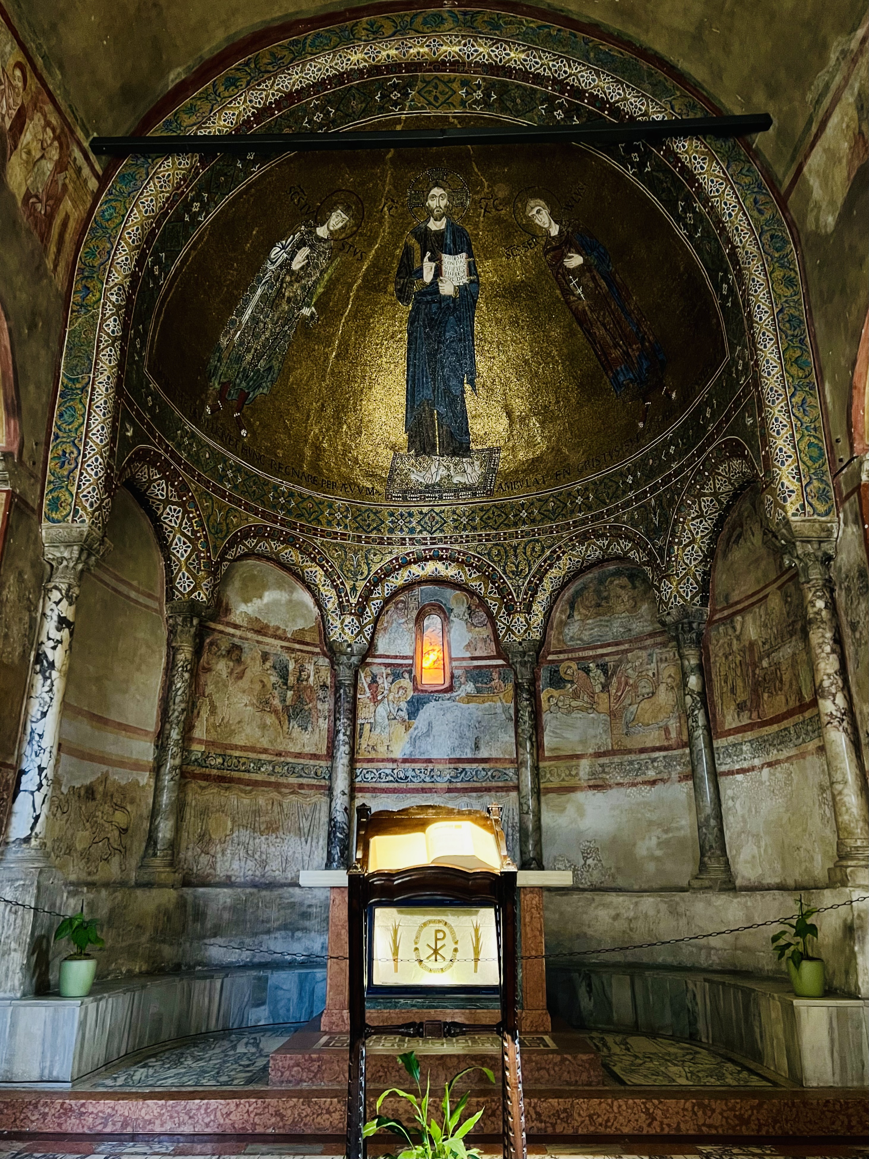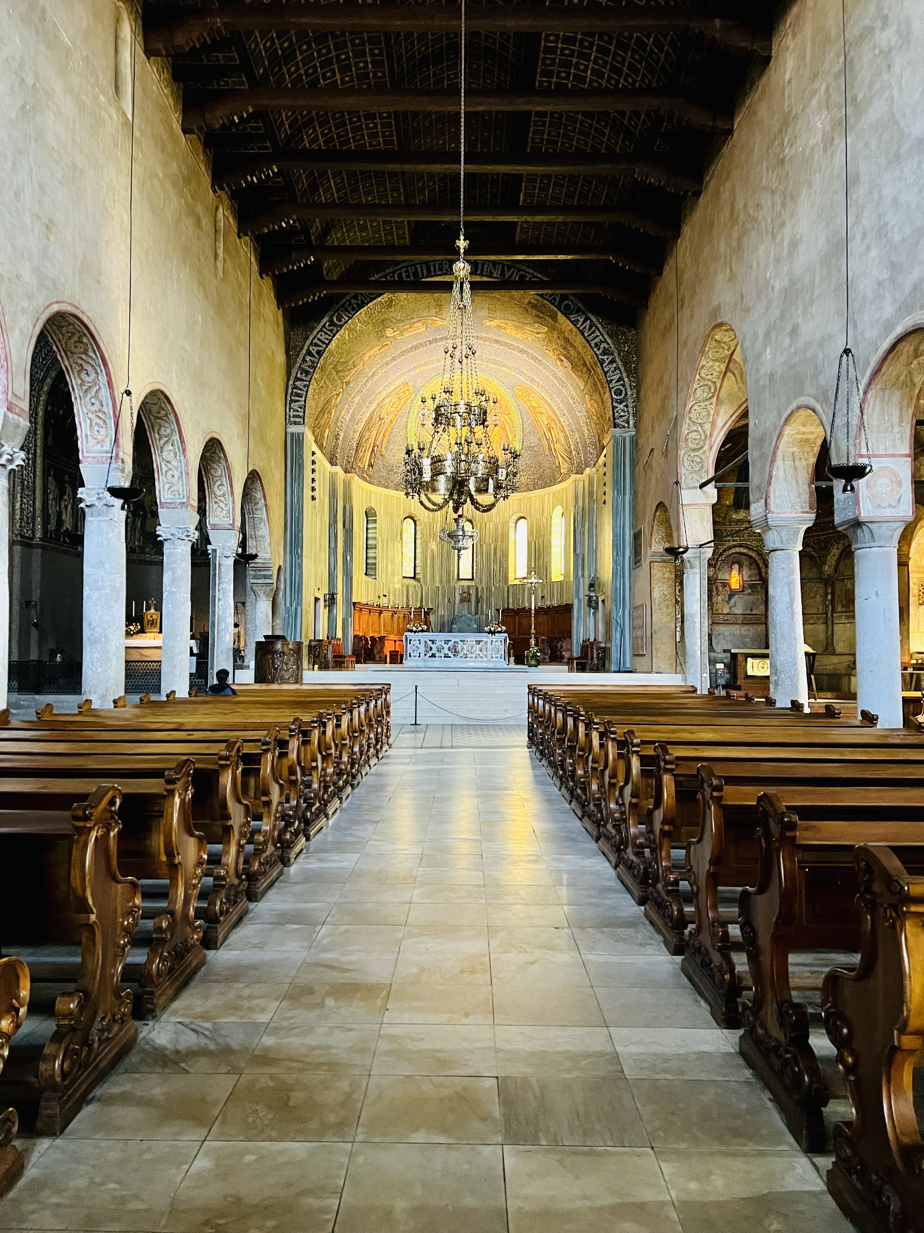 All’interno la cattedrale è davvero interessante con tracce di pavimentazioni musive del V secolo davanti al presbiterio, mentre l’abside è decorata con mosaici moderni. Gli affreschi rappresentati la vita del Santo sono risalenti al XIII secolo.