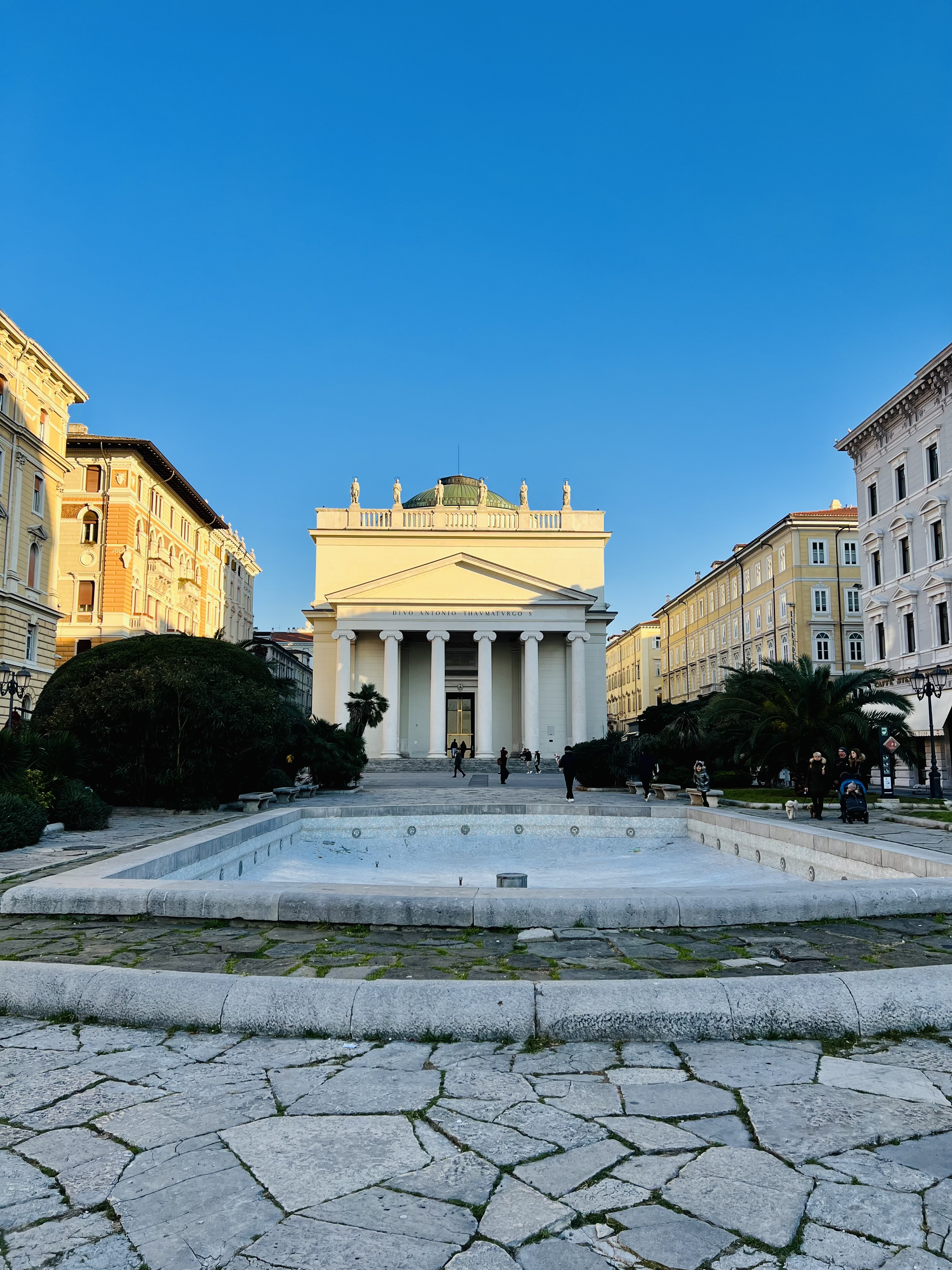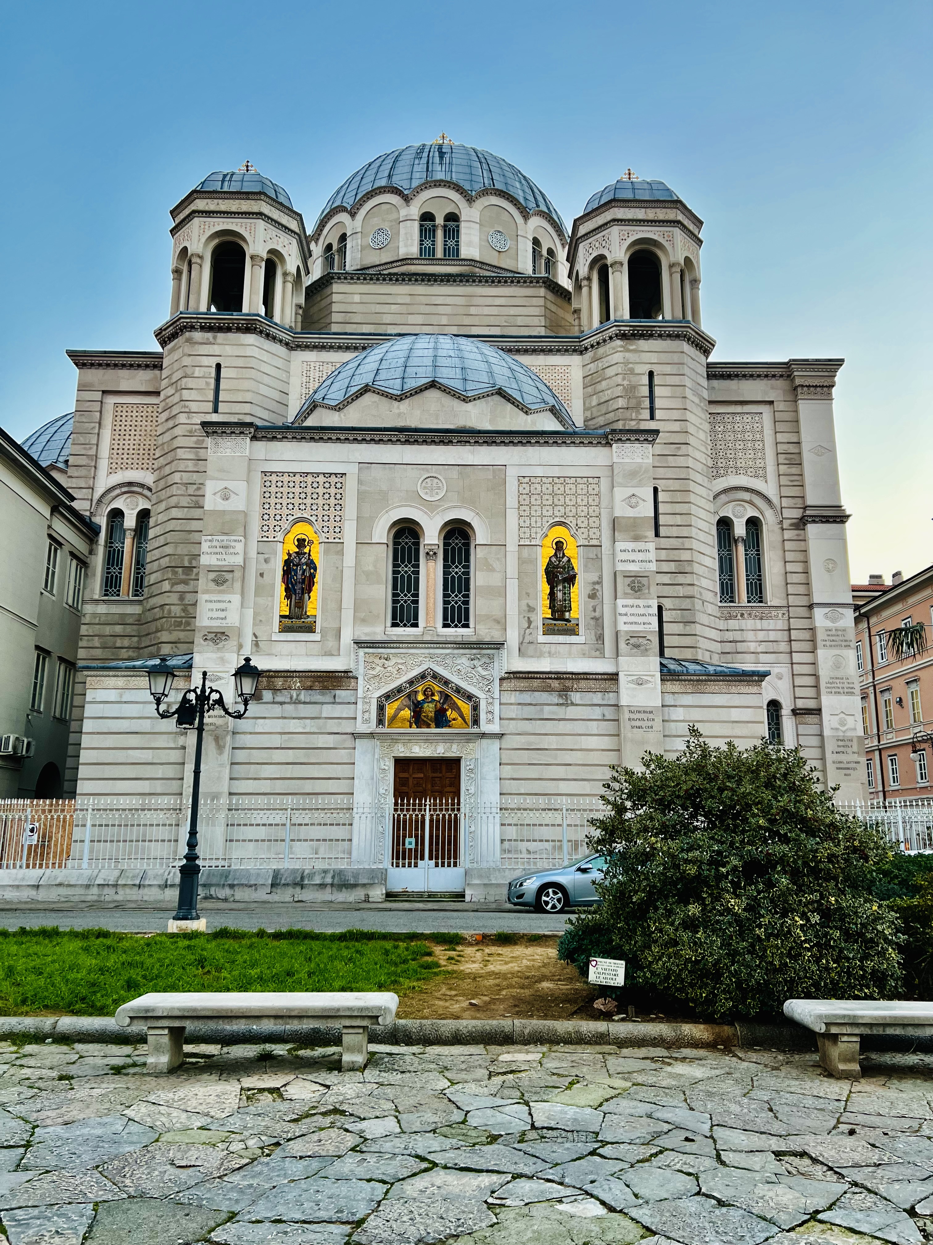 Dando le spalle alla Chiesa, quindi con lo sguardo verso il mare troviamo sul lato destro: la Chiesa Serbo Ortodossa di San Spiridione la più importante d’Italia, a croce greca con richiami allo stile neobizantino. Sul lato sinistro troviamo il bellissimo Palazzo Gopcevich, sede del Civico Museo Teatrale “Carlo Schmidl”.