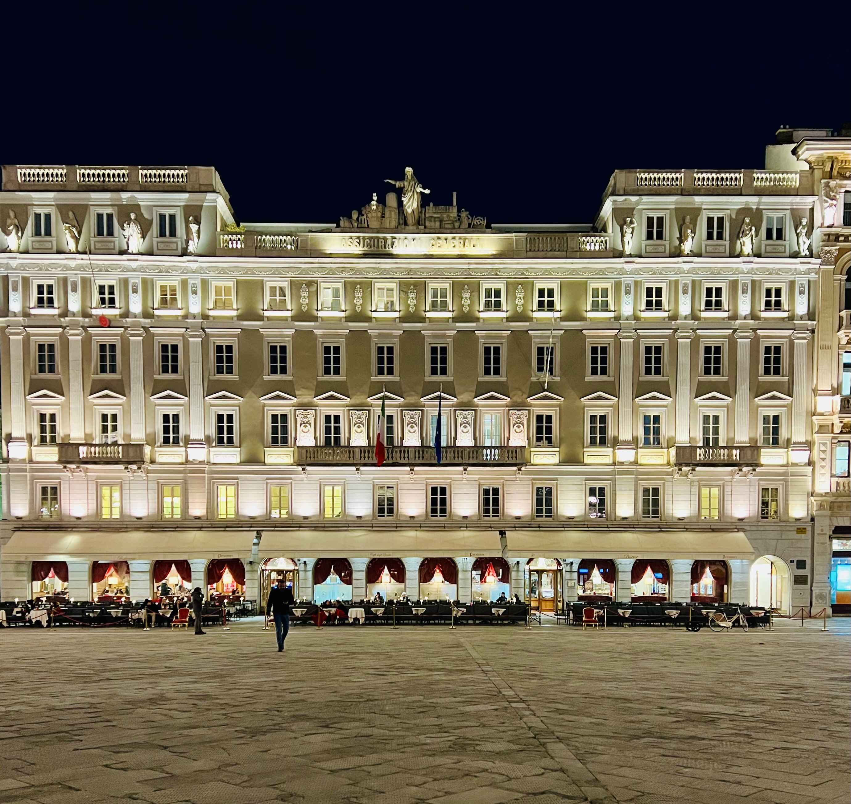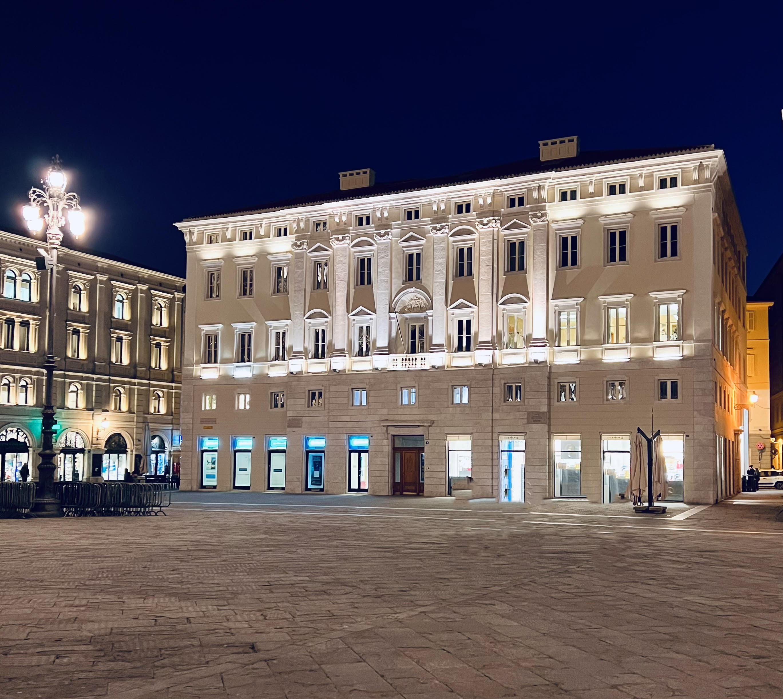 Nel tempo ha cambiato più volte aspetto, del giardino dell’epoca austriaca non resta nulla, mentre il mare dell’antico mandracchio rivive nelle luci blu poste a terra. È la più grande tra le piazze europee con affaccio sul mare e, senza dubbio, una delle più belle.