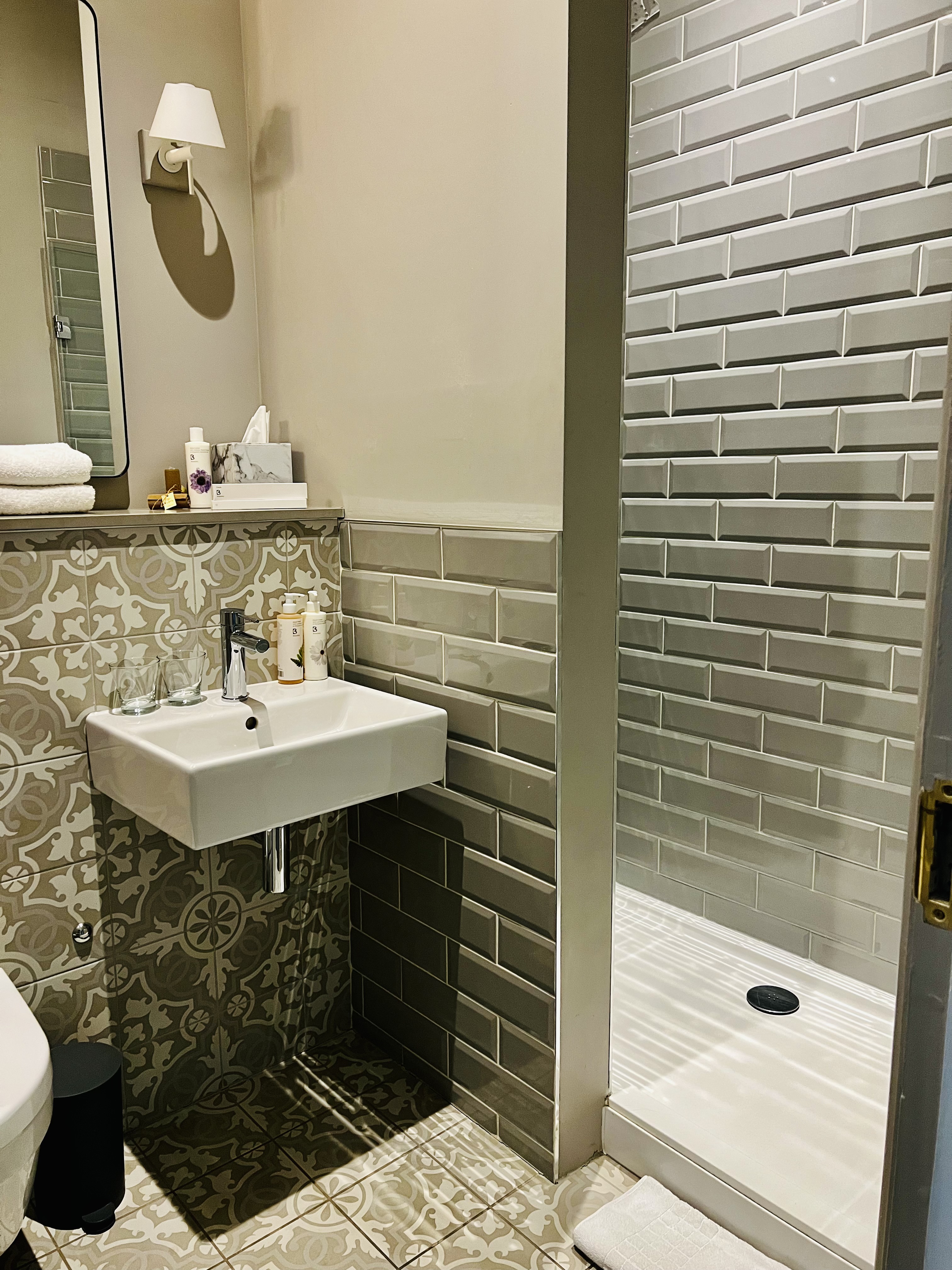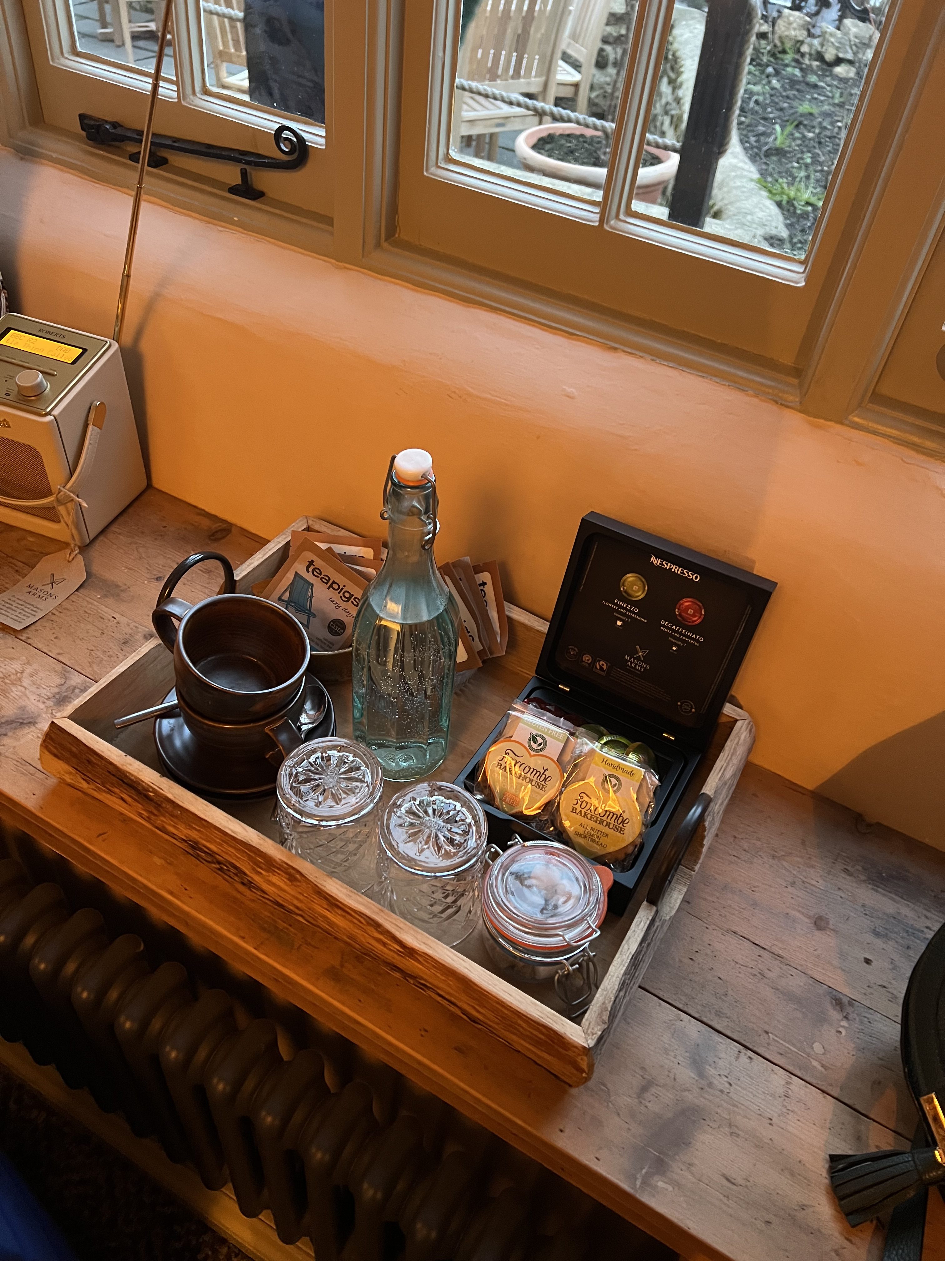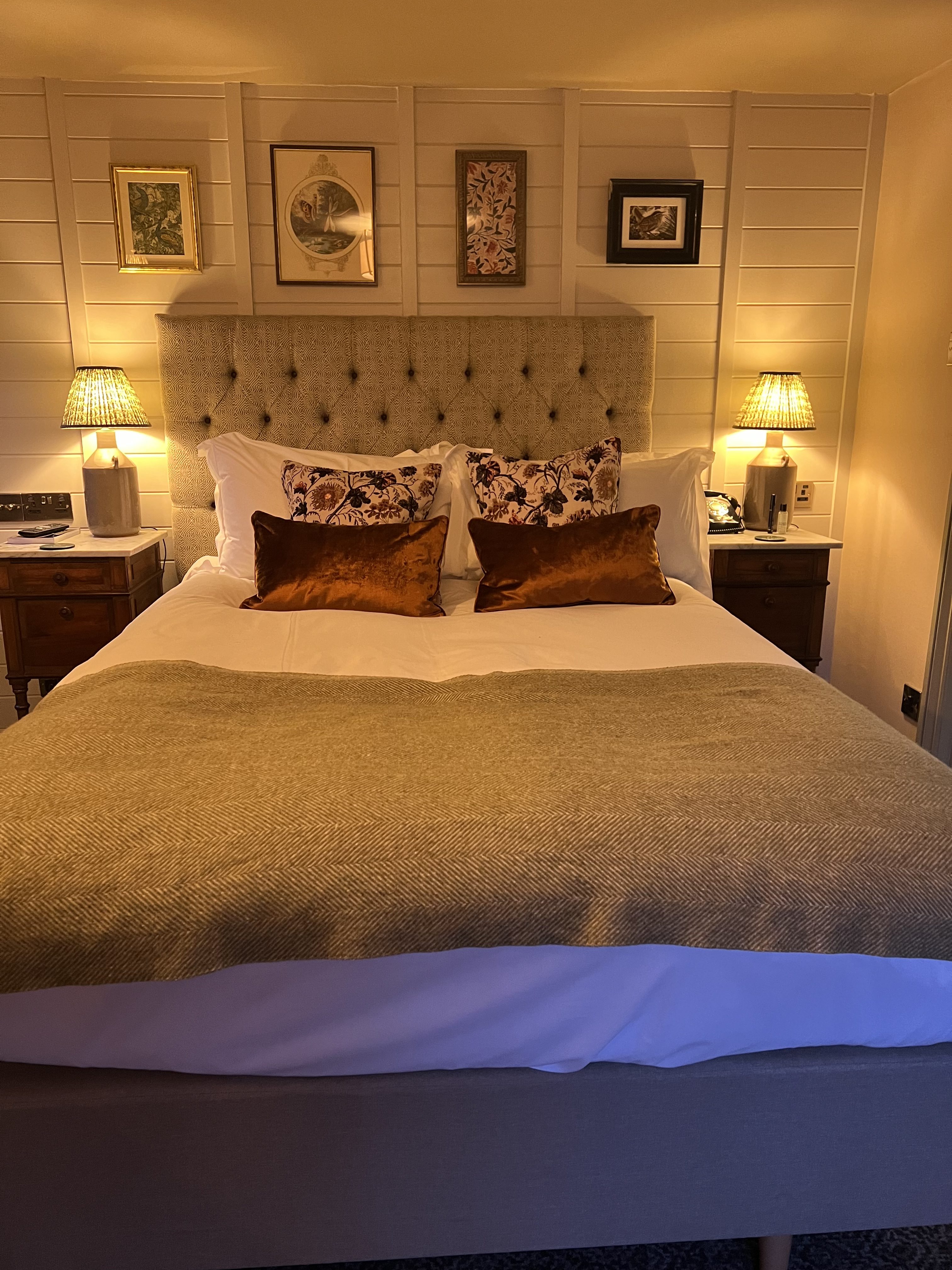 Il pub ristorante e alcune camere si trovano su un edificio risalente al quattordicesimo secolo. Noi abbiamo dormito in un edificio staccato (dove ci sono i cottage) di qualche metro, sulla collinetta. La camera davvero magnifica arredata e curata nei dettagli, materassi, cuscini, coordinati letto, le spugne tutto di ottima qualità – questo vale anche per le altre strutture – ogni dettaglio della camera davvero stupendo, dalla console, alla panca, alle tende, il bagno piccolo ma prezioso, con i classici sanitari inglesi che adoro.